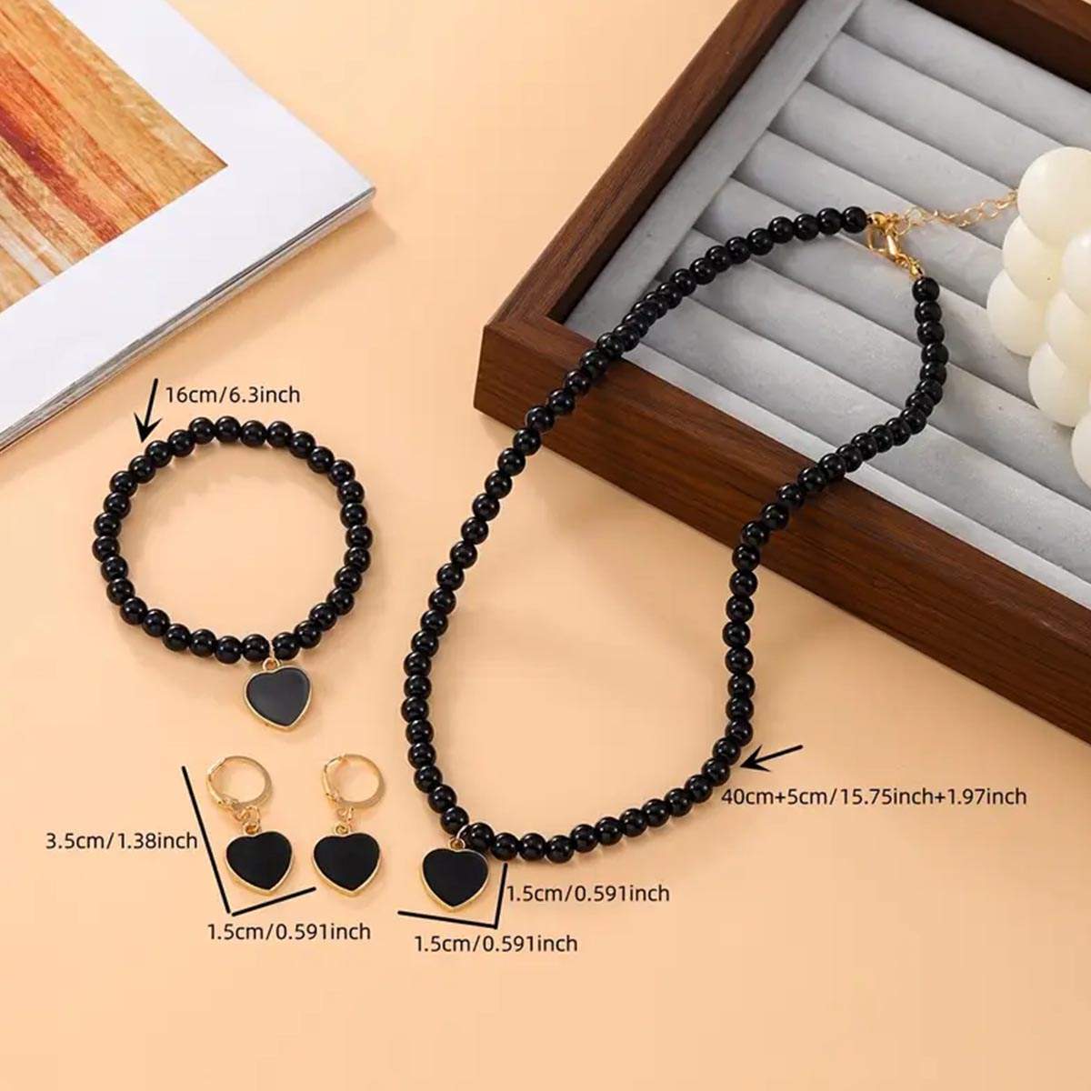 Το boho σετ με μαύρες χάντρες4 τεμαχίων είναι η ιδανική επιλογή για να προσθέσετε μια κομψή και boho πινελιά στις εμφανίσεις σας. Το σετ περιλαμβάνει κολιέ, βραχιόλι και σκουλαρίκια, όλα διακοσμημένα με μαύρες χάντρες και εντυπωσιακά μενταγιόν σε σχήμα καρδιάς.