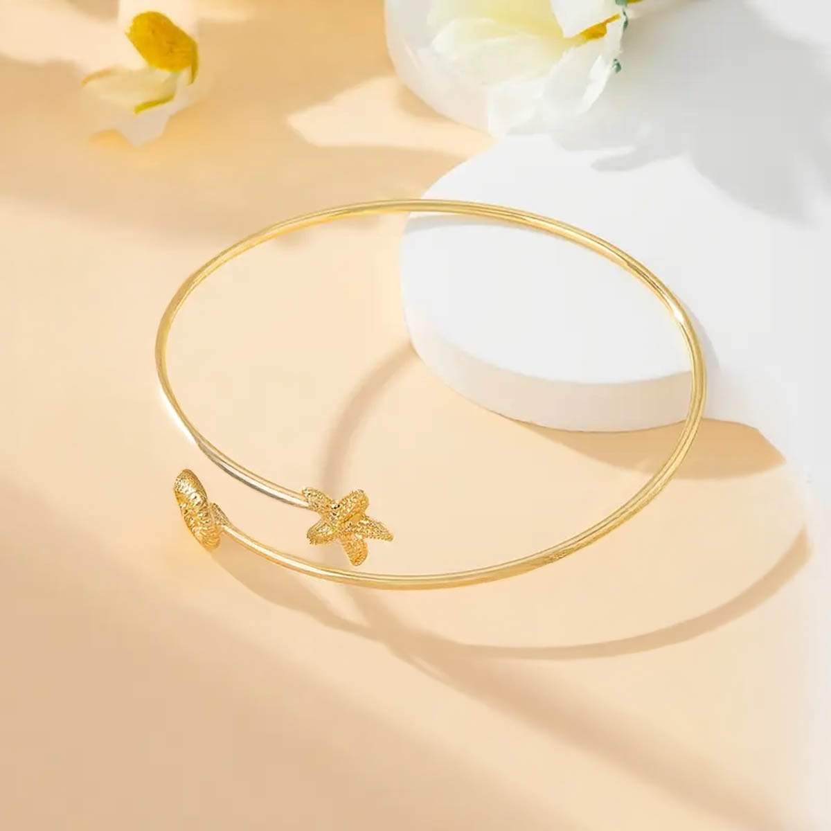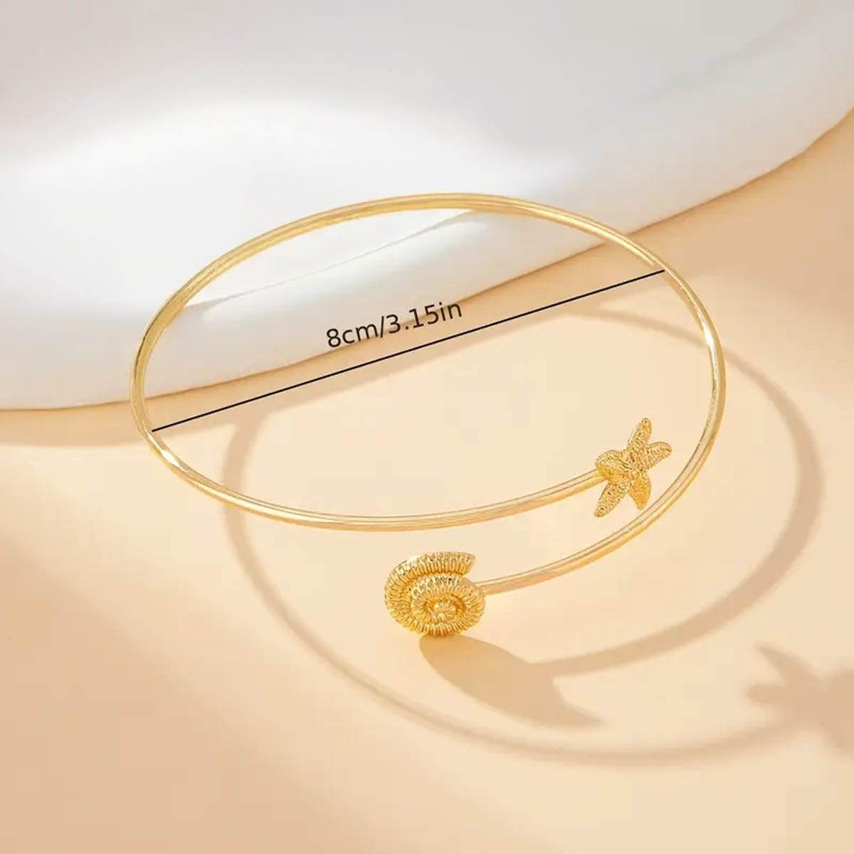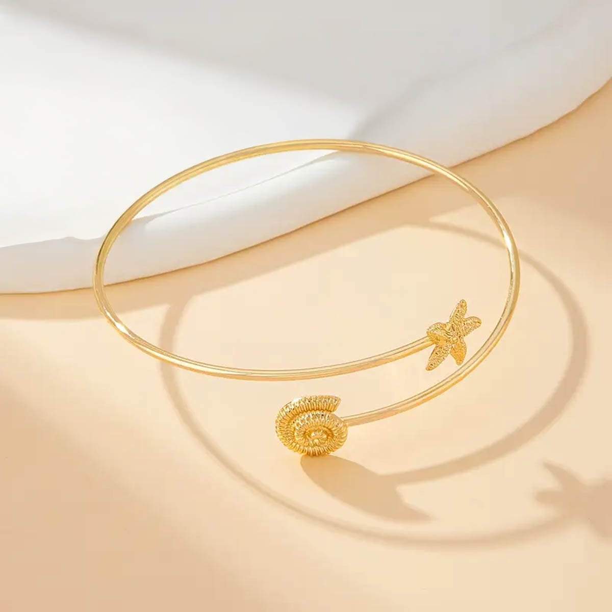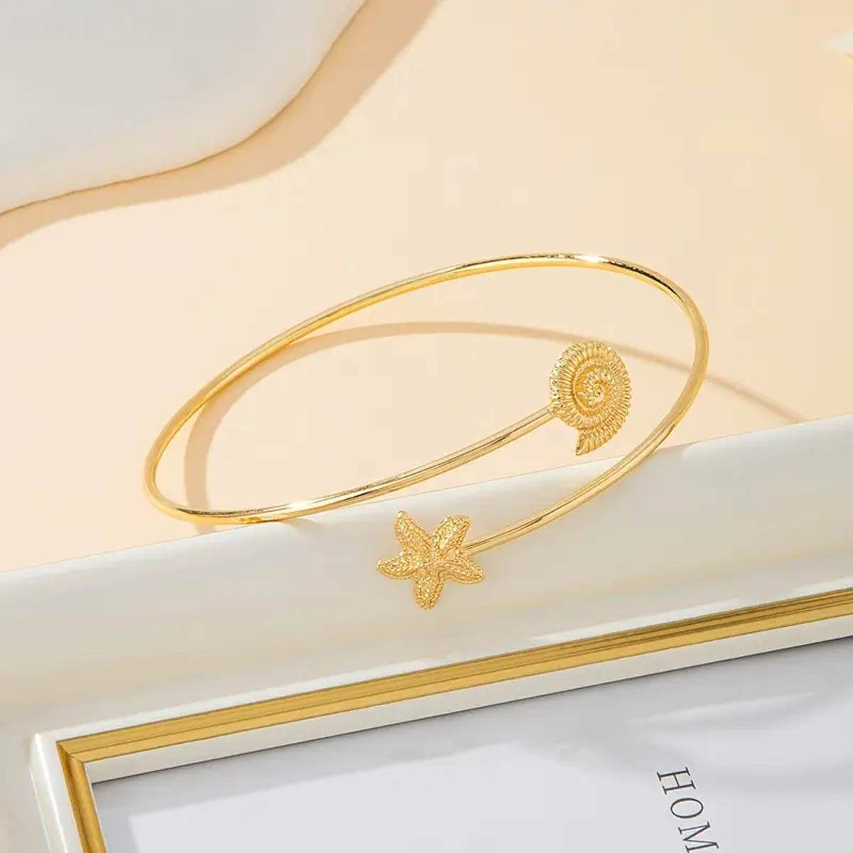 Χρυσό boho arm cuff – κόσμημα εμπνευσμένο από τη μαγεία του βυθού και τη bohemian ελευθερία. Αυτό το λεπτό arm cuff σε χρυσή απόχρωση στολίζεται από ανάγλυφο conch και διακριτικό αστερία, δημιουργώντας ένα αξεσουάρ ιδανικό για summer styling με artful χαρακτήρα.