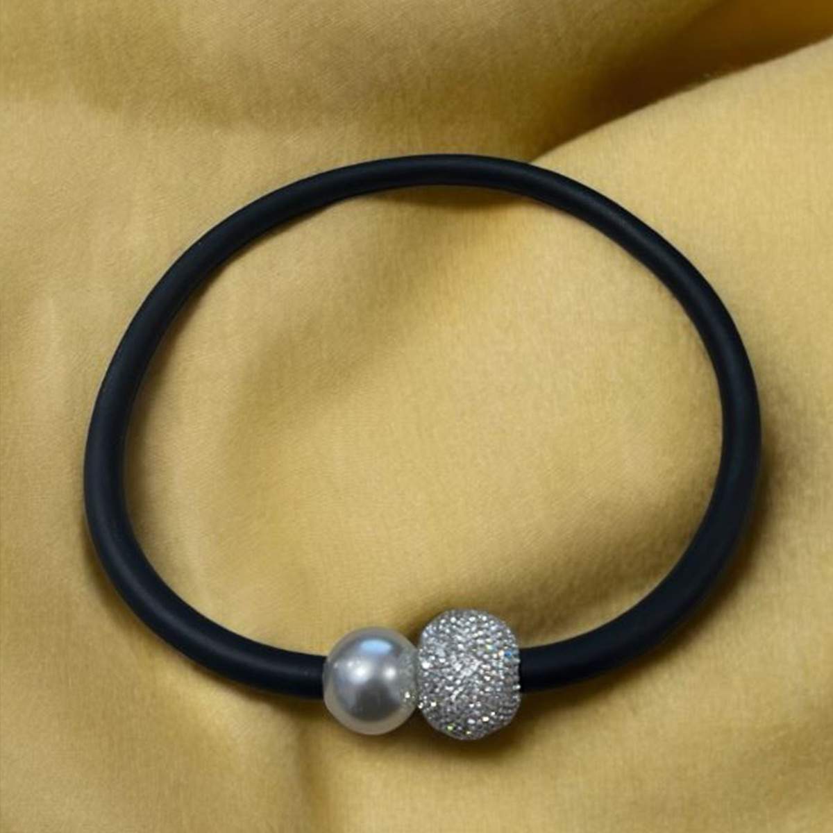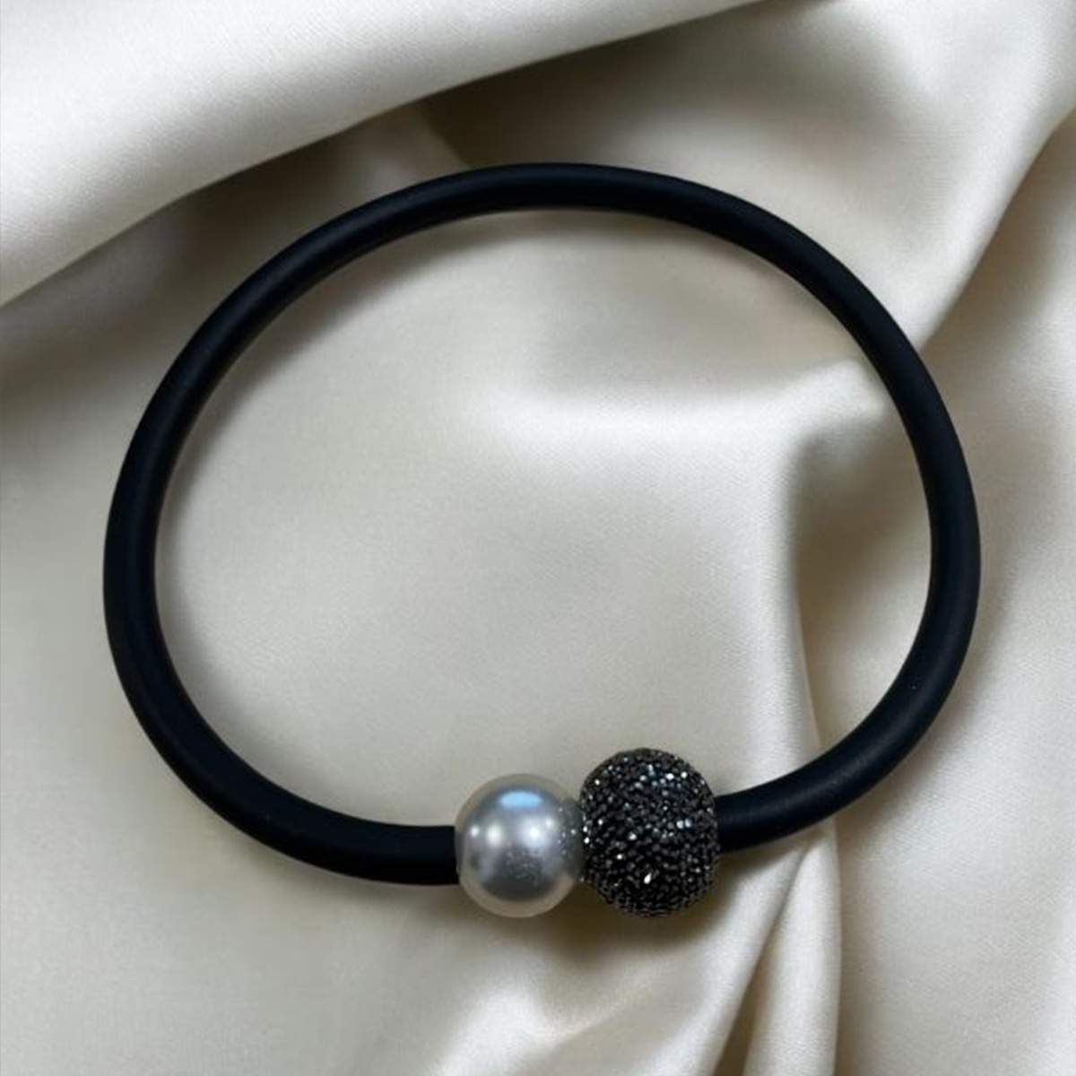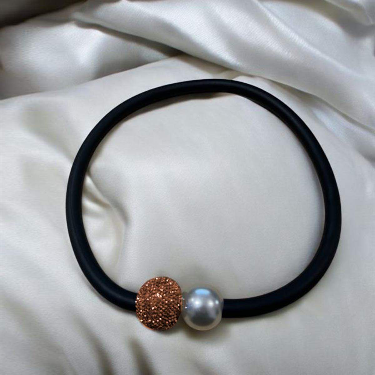 Το τελευταίο hot trend rubber τσόκερ, ανοιγόμενο κολιέ που κλείνει μπροστά εύκολα με μαγνήτη. Με λαμπερές μεγάλες χάντρες πέρλας και strass σίγουρα θα τραβήξει όλα τα βλέμματα. Περίμετρος 20cm. Σε 3 χρώματα, μαύρο, ασημί και μπρονζέ, το must have κόσμημα για τις γιορτές.